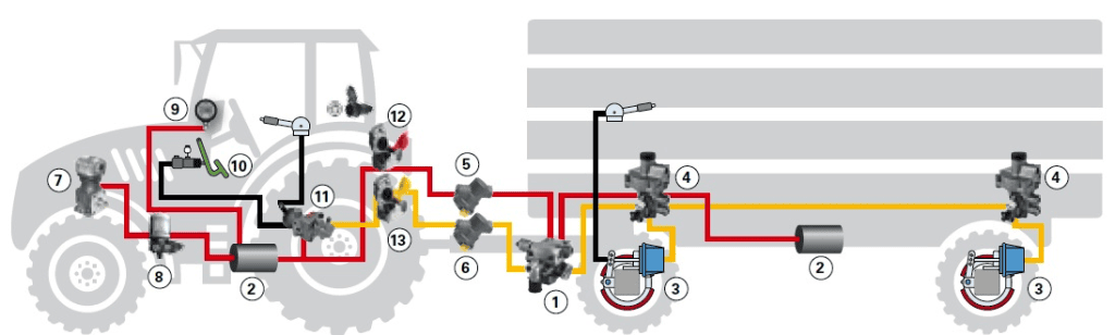 1. ábra. Járműszerelvény kétvezetékes légfékrendszerének vázlata1 pótkocsi fékszelep; 2 légtartály; 3 fékhenger; 4 ALB (terhelésérzékelő vezérlő); 5 tápcsatlakozófej szűrővel; 6. fékvezérlő csatlakozófej szűrővel; 7 kompresszor; 8. légszárító; 9 nyomásmérő; 10 főfékhenger, fékpedál; 11 kétvezetékes pótkocsi vezérlőszelep; 12 tápcsatlakozófej; 13 fékvezérlő csatlakozófej, forrás: www.paul-forrer.ch