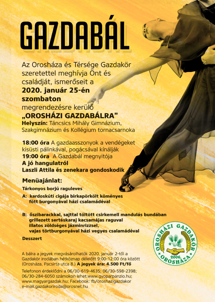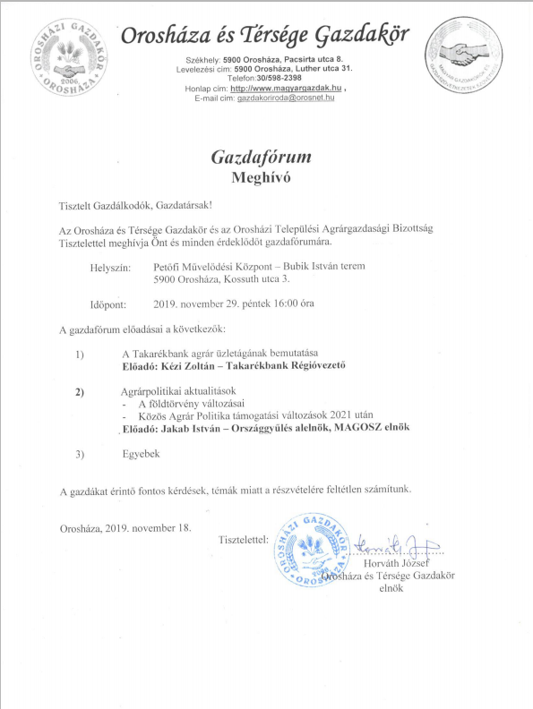 Az Orosháza és Térsége Gazdakör tisztelettel meghív minden gazdálkodót, érdeklődőt a 2019. november 29.-i Gazdafórumára.